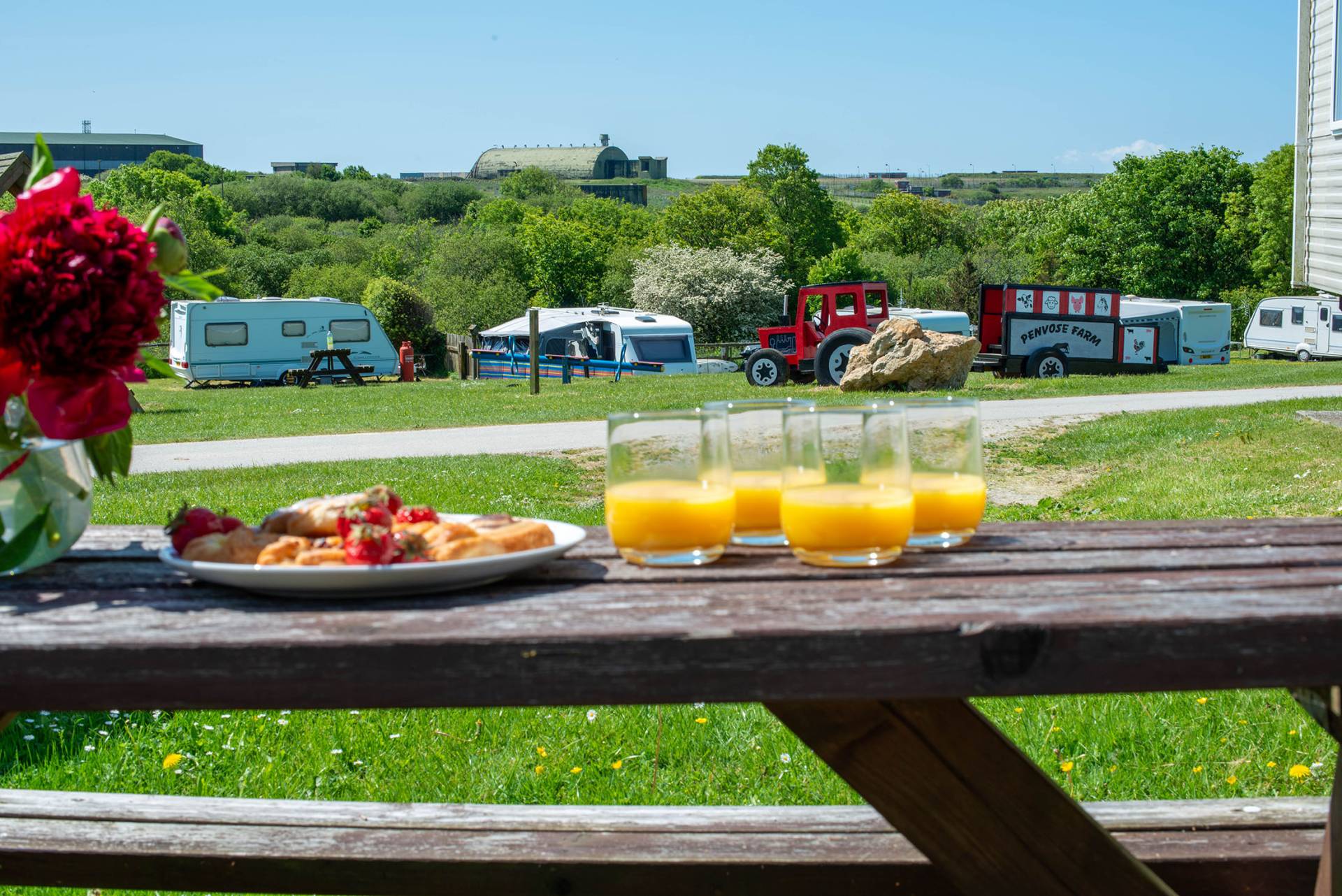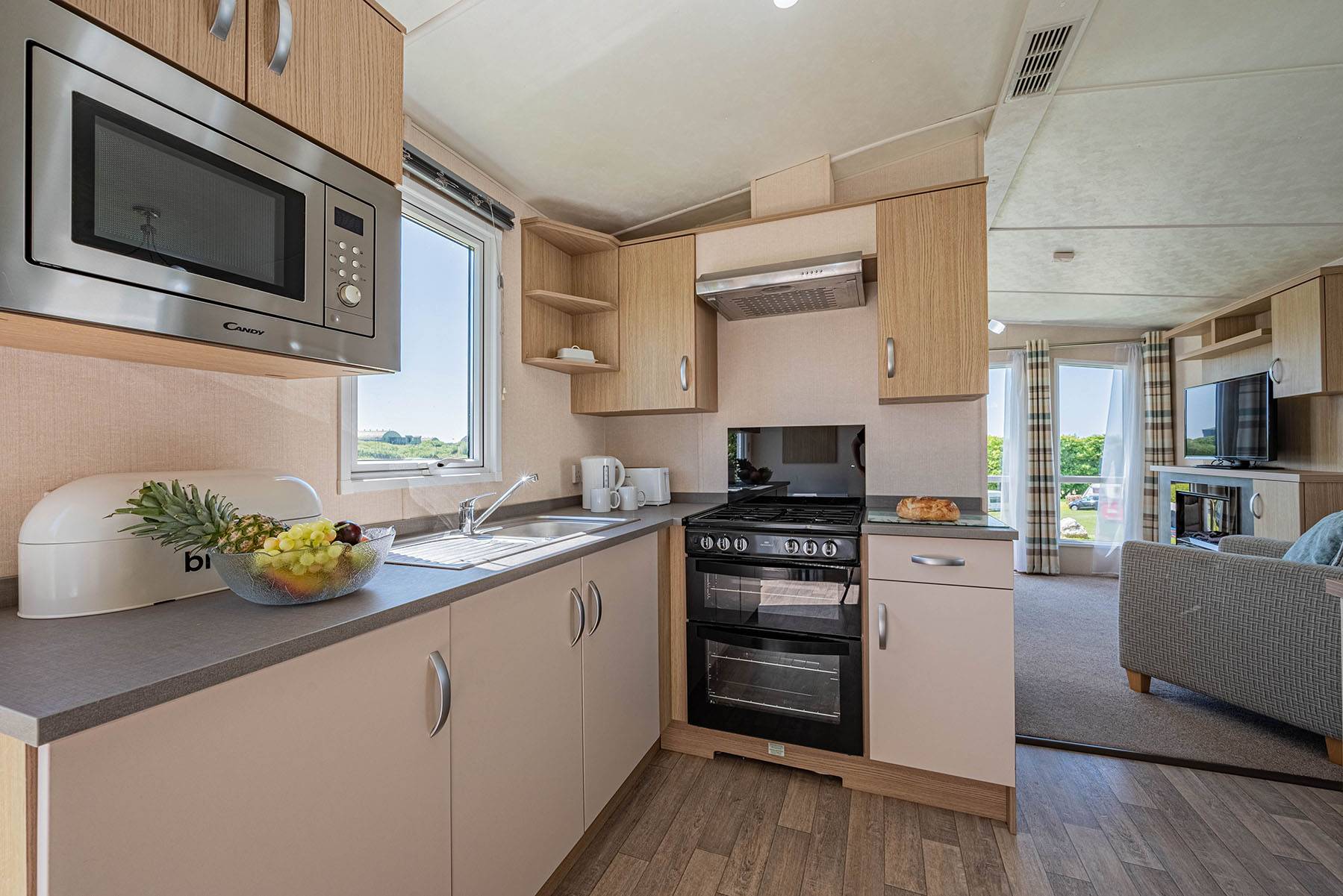 This Static Holiday Caravan in Cornwall has an open plan layout with a large lounge area and cosy armchair. Sleeping arrangements consist of a double bedroom with en-suite wc, large wardrobe and TV, one twin room and additional pullout concealed double in the lounge area. The main bathroom has a large bath, shower cubicle wc and hand-basin.